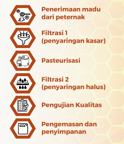 Kami memiliki laboratorium untuk memantau mutu produk, dimulai dari analisis madu yang diterima dari peternak. Proses produksi mengikuti standar industri makanan dan obat-obatan, dengan perhatian khusus pada sterilisasi ruang dan mesin produksi.